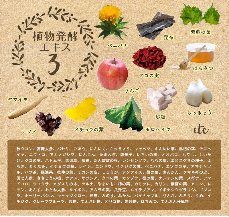 | 原材料 | サフラワー油、植物発酵エキス末、山西老陳酢濃縮粉末、江蘇鎮江香酢濃縮粉末、Lーカルニチン酒石酸塩、キャンドルブッシュエキス、コエンザイムQ10、殺菌乳酸菌(ECー12株)/ゼラチン(ブタ由来)、グリセリン、ミツロウ、グリセリン脂肪酸エステル、イカスミ色素、ビタミンB1(原材料の一部にゼラチン、キウイフルーツ、もも、りんご、大豆、やまいも、小麦、乳を含みます。) |