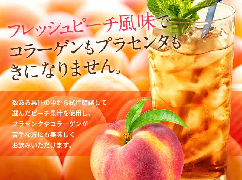 | 原材料 | 果糖ブドウ糖液糖、コラーゲンペプチド、プラセンタエキス末、ピーチ果汁、植物発酵エキス/クエン酸、香料、ビタミンC、保存料(安息香酸ナトリウム)、着色料(カラメル)、甘味料(スクラロース)、サイクロデキストリン、増粘剤(キサンタンガム)(原材料の一部にキウイフルーツ、もも、りんご、大豆、やまいもを含みます。) |