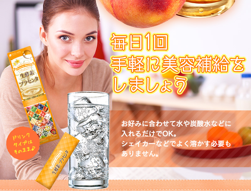 キレイな毎日をサポートする為に230種類の“植物発酵エキス”と美容の味方、“プラセンタエキス”と“コラーゲン”をギュッと詰め込みました。美容や健康管理の為に美味しく簡単にたっぷりのプラセンタやコラーゲン、植物発酵エキスを補給できます。味しいピーチ風味のドリンクです。持ち運びに便利な個包装です。