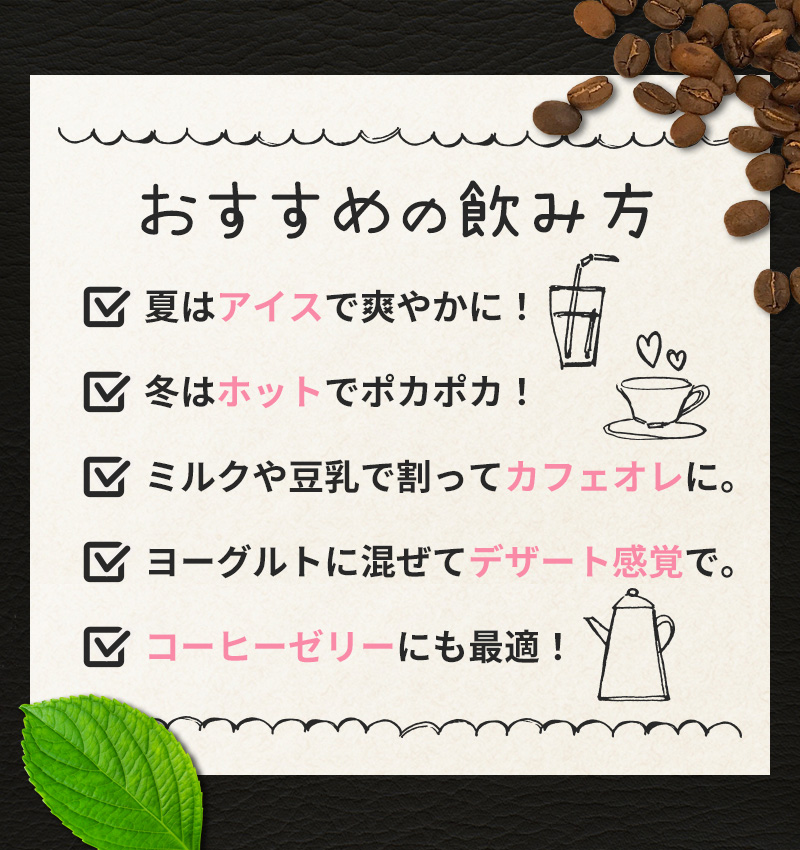 45g・100gサイズ 〇3~5g(小さじ1杯)を100ml~150mlのお湯または水に溶かしてよくかき混ぜてからお飲みください。 3g×20包サイズ 〇ホットの場合〇 1包を150mlのお湯に溶かしてよくかき混ぜてお召し上がりください。 〇アイスの場合〇 1包を90mlのお湯または水に溶かしてよくかき混ぜ、氷を入れてお召し上がりください。 【いろんなアレンジで続けられる】 ☆アイスでもホットでも ☆ミルクや豆乳で割って美味しいカフェオレにも |